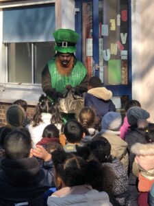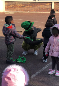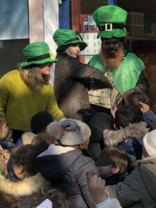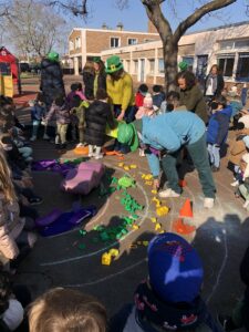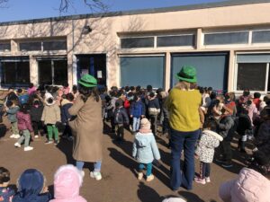 A l’occasion de la Saint Patrick, toutes les classes de l’école maternelle Honoré de Balzac se sont retrouvées dans la cour pour accueillir toute une délégation de lutins « chapeautés » de verts, venus fêter avec eux cette célèbre fête irlandaise !