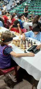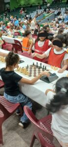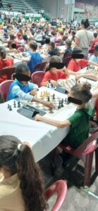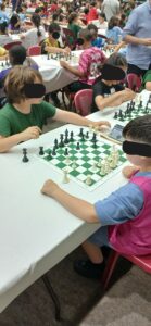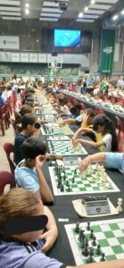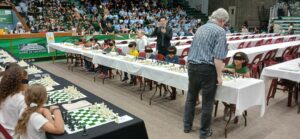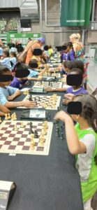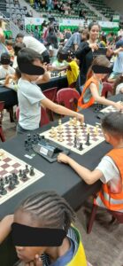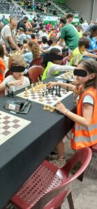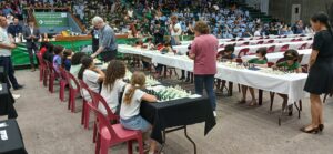 La partie en « simultanée », les 18 meilleures joueurs ( une fille et un garçon de chaque école) affrontent un joueur expert. Lui est seul à les affronter et passe d’échiquier en échiquier après chaque coup joué.
