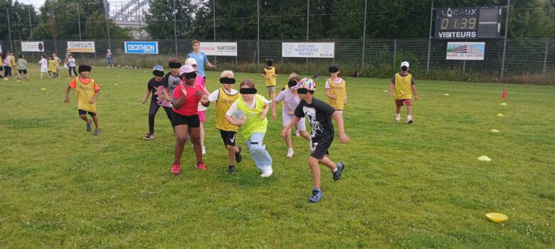 Sous un ciel miraculeusement moins « cuisant », 12 classes de CE2, CM1 et CM2, soit 270 élèves environ, qui avaient pris part durant l’année aux cycles dédiés à la pratique du rugby, avec l’appui de Ruben et Vincent, les éducateurs sportifs du club du Racing Nanterre rugby, sont venues se rencontrer…